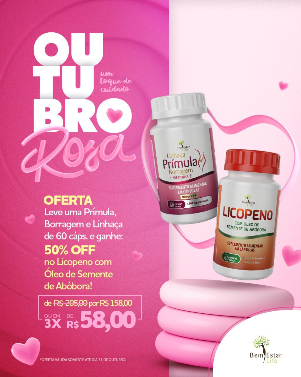 🎁 OFERTA CUIDADO INTEGRAL FEMININO: Na compra do Prímula, Borragem e Linhaça, você garante 50% de desconto no Licopeno!
